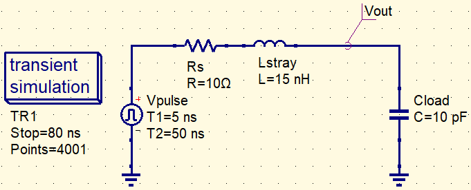 Usamos el siguiente circuito mínimo como base común y comparamos cuatro casos cambiando únicamente el elemento en serie. El punto de observación es Vout (nodo superior de Cload).