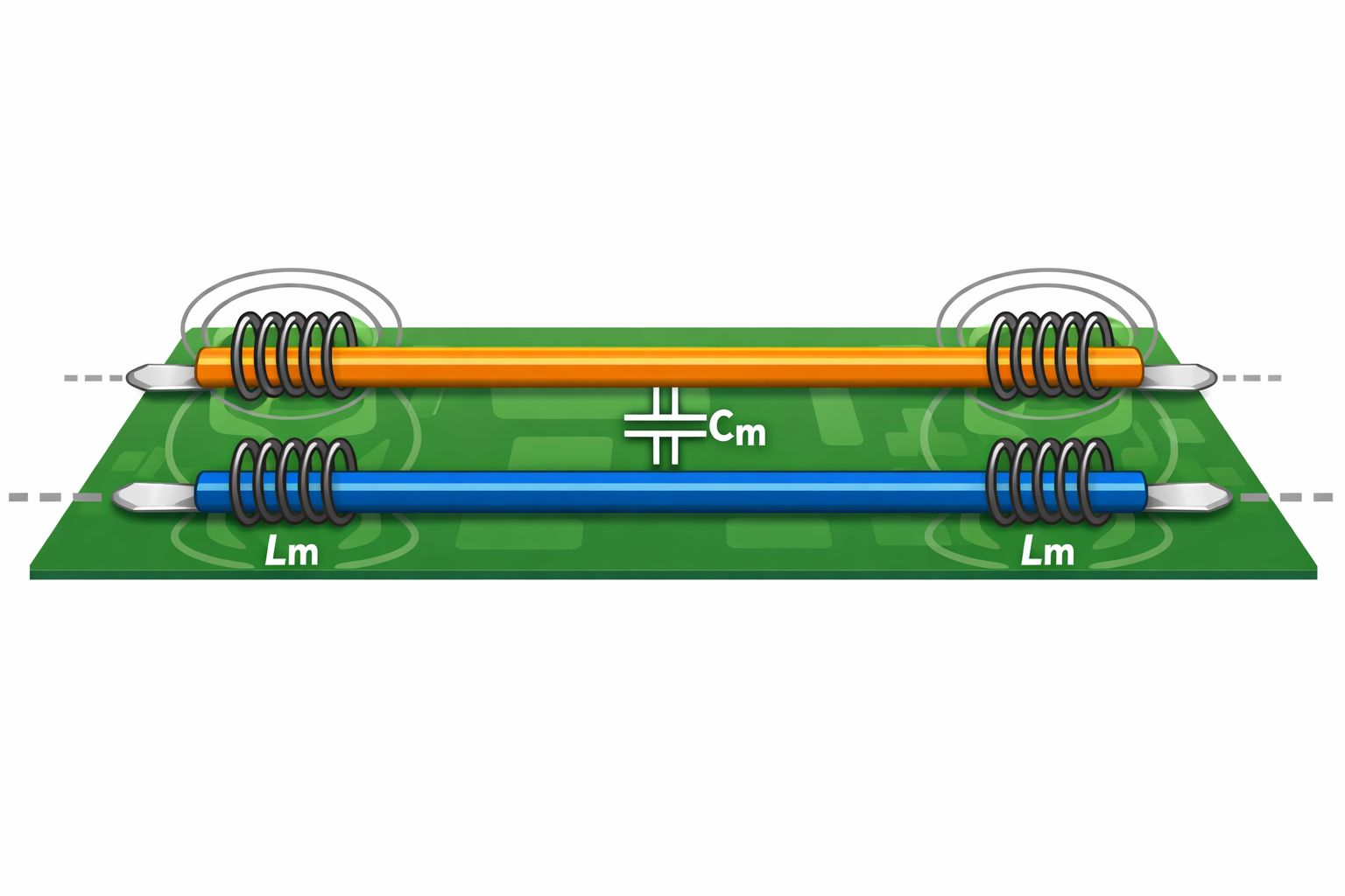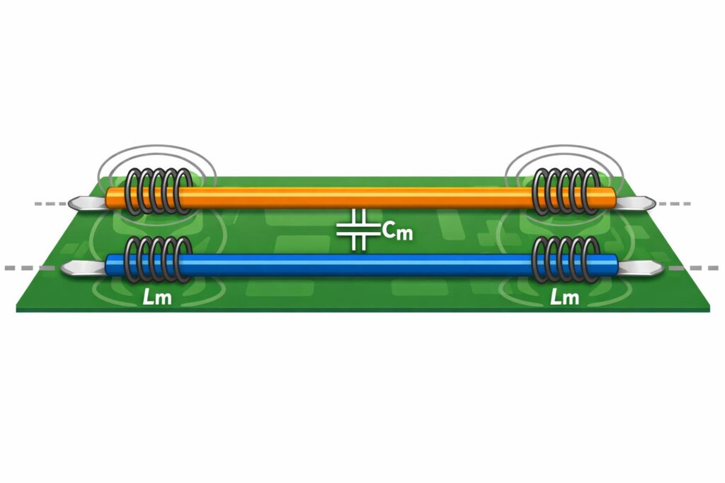 Em uma PCB real, a capacitância de acoplamento (Cm) existe entre trilhas adjacentes, e a indutância de acoplamento (Lm) existe entre os laços de corrente formados pelas trilhas de sinal e seus caminhos de retorno. Mesmo que esses elementos parasitas não apareçam nos esquemas, eles estão sempre presentes.