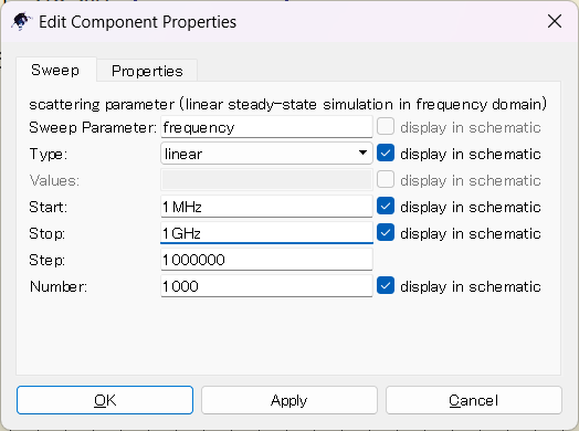 双击“s-parameter simulation”组件,设置频率范围和点数/步长。这里设置的频率范围和步长将反映在导出的S参数中。