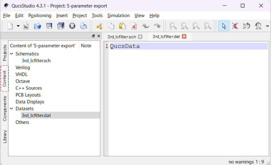 检查波形和史密斯图表,确认仿真结果无误,并在“内容”标签的Datasets中查看.dat文件。如果内容标签中未显示.dat文件,请保存项目,关闭QucsStudio后重新打开项目。